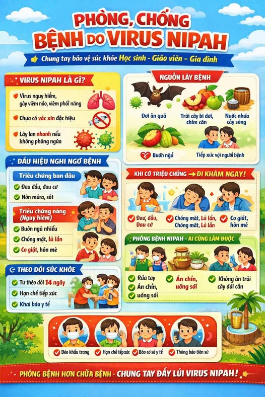 Hiện nay tại một số quốc gia khu vực châu Á ghi nhận ca bệnh do Virus Nipah – một bệnh truyền nhiễm nguy hiểm có thể lây từ động vật sang người và qua tiếp xúc gần với người bệnh. Bệnh này có thể gây sốt, đau đầu, khó thở, và trong một số trường hợp nghiêm trọng ảnh hưởng đến hệ thần kinh