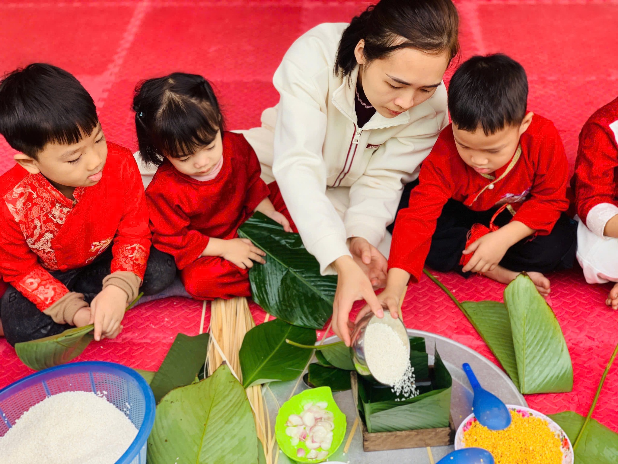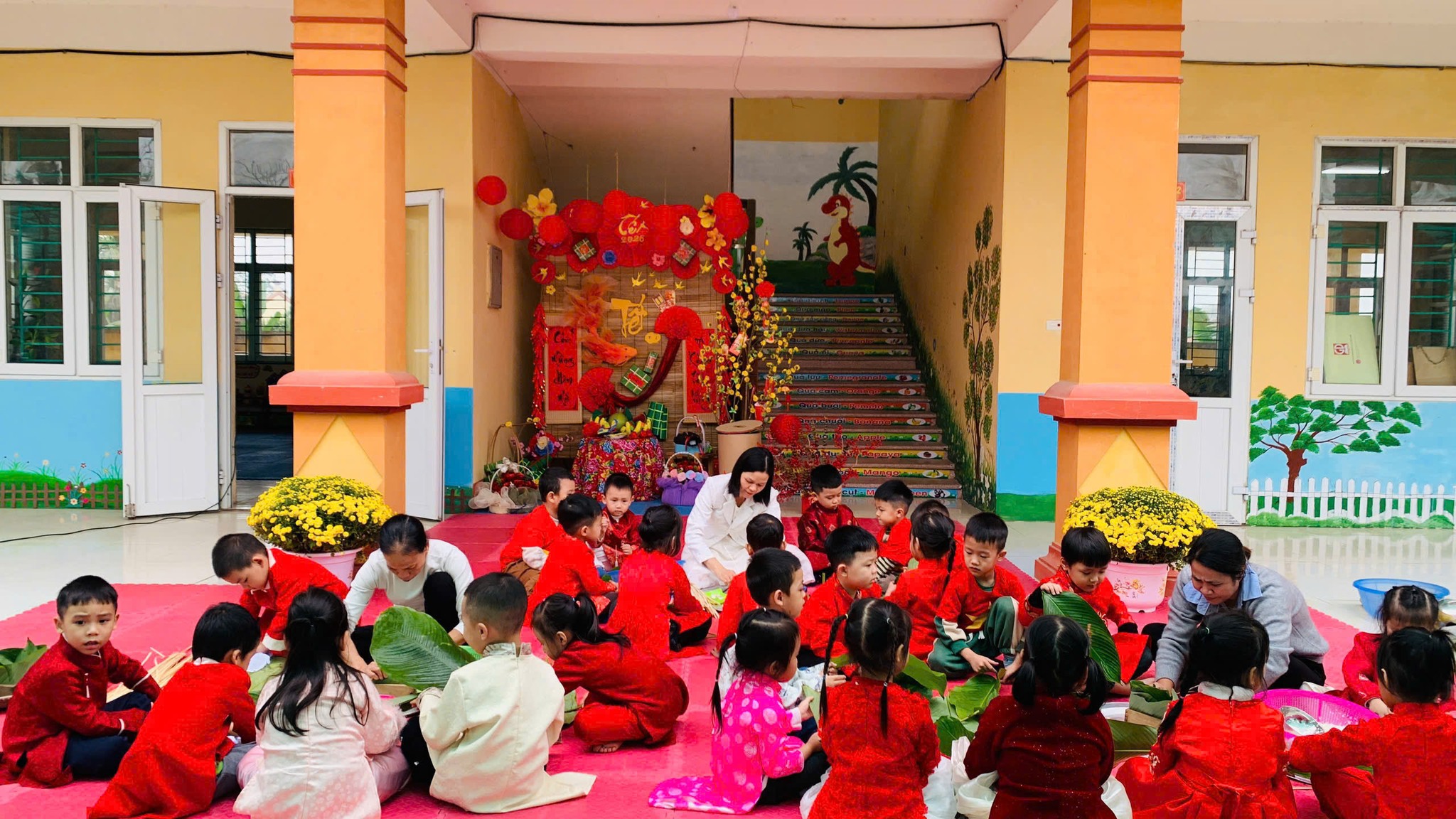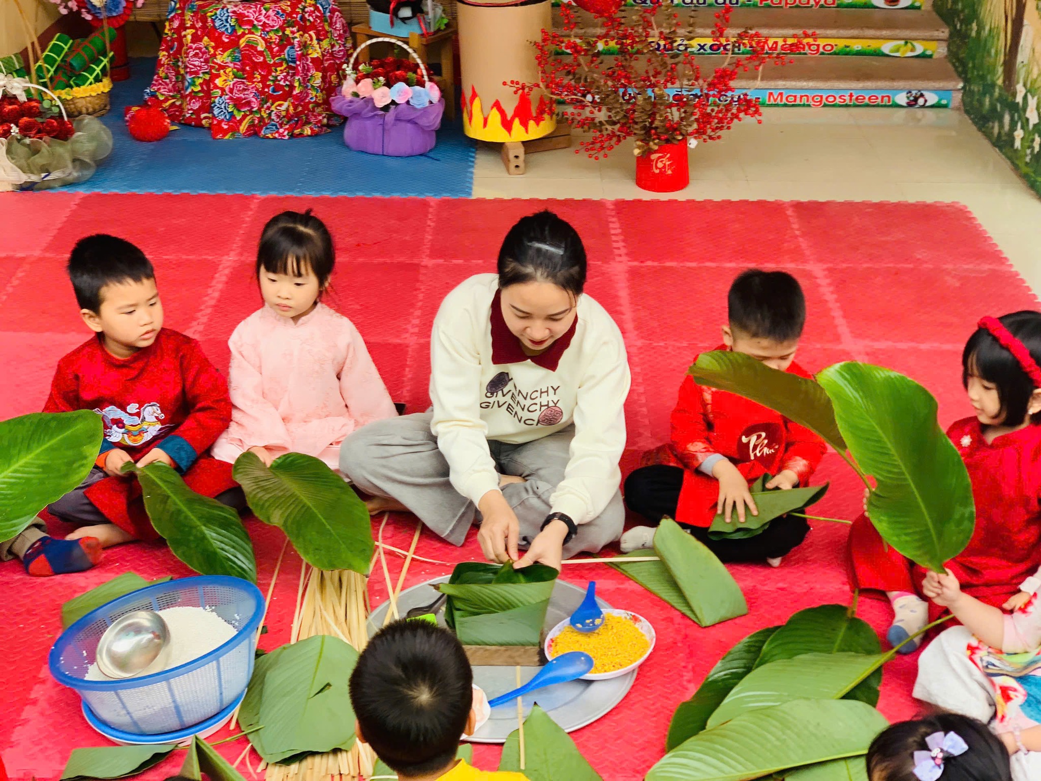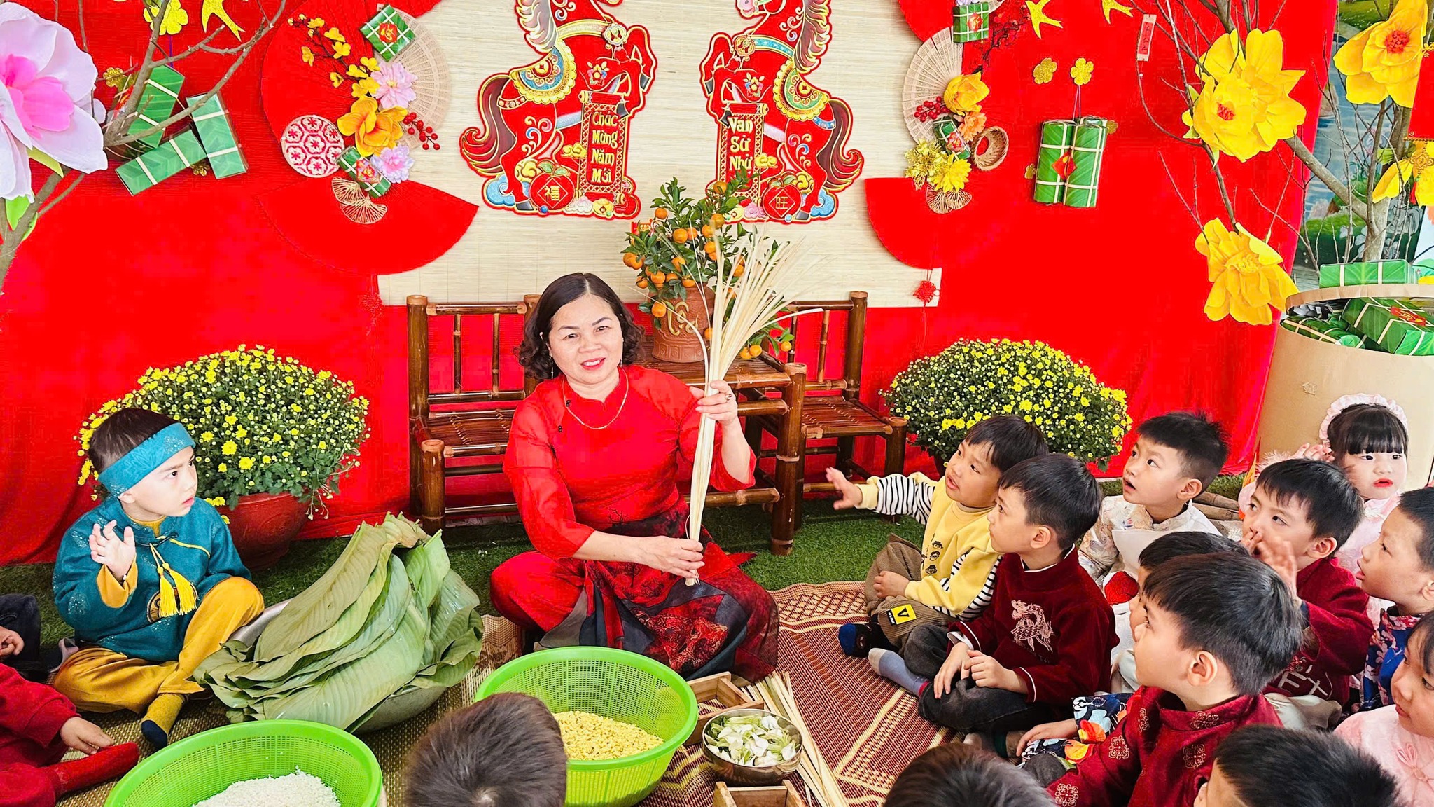 Trong thời gian diễn ra các hoạt động, trẻ được tham gia trang trí lớp học, làm đồ dùng – đồ chơi theo chủ đề Tết, gói bánh chưng, làm mứt dừa,… Thông qua sự hướng dẫn của giáo viên, các hoạt động được tổ chức phù hợp với lứa tuổi, đảm bảo an toàn, tạo điều kiện để trẻ được trải nghiệm, khám phá và phát huy tính tích cực, sáng tạo.